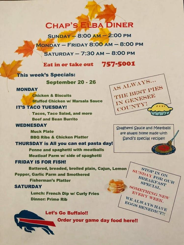 Welcome to Chaps Elba Diner, your go-to destination for classic American diner fare in Elba, NY. Located at 5 S Main St, our cozy spot serves up delicious breakfast, lunch, and dinner, featuring homemade pies and a delightful bakery on-site. Whether you're enjoying a meal in our relaxed atmosphere or taking advantage of our takeout and delivery options, you'll find something to satisfy every craving. We also offer catering services for events of all sizes, ensuring delicious comfort food for any occasion. Join us for a hearty meal and experience the warm hospitality that makes Chaps Elba Diner a local favorite!