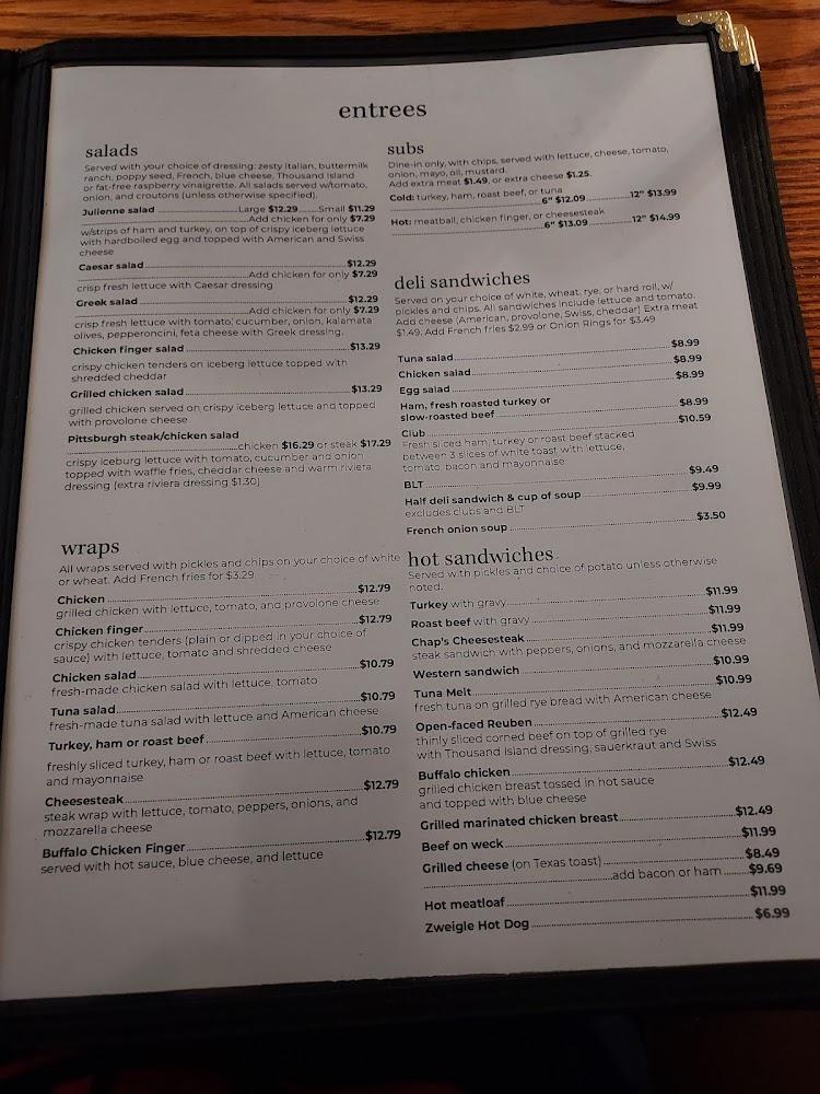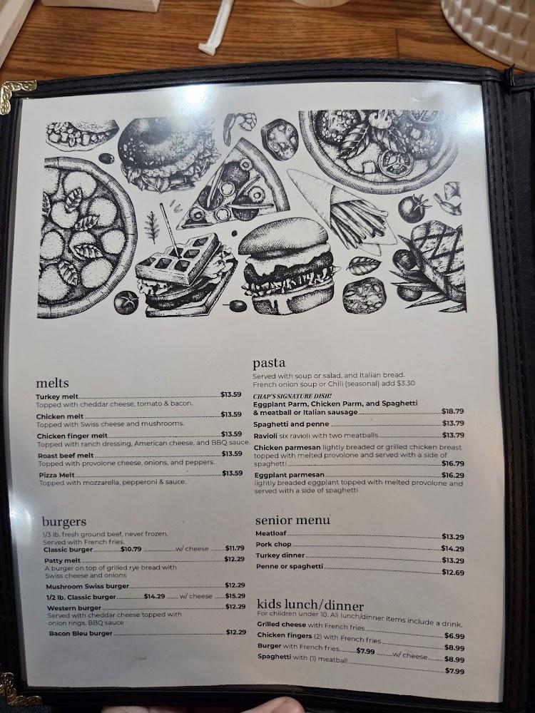 The menu at Chaps Elba Diner features a wide selection of American classics. Breakfast includes pancakes, scrambled eggs, and crispy bacon. Lunch and dinner menus offer something for every taste. Guests can enjoy burgers, sandwiches, pasta, and homemade soups. Don't overlook the appealing dinner specials like Southern Fried Chicken and Grilled Pork Chops.